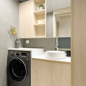 入口區域騰出空間建造多功能傢俬,提升層次感。為隱藏橫樑,設計師加裝燈槽和假天花,讓天花線條更為統一。利用樓高的優勢,設計出大型櫃型,為屋主在有限空間內創造出高私隱度的獨立空間。